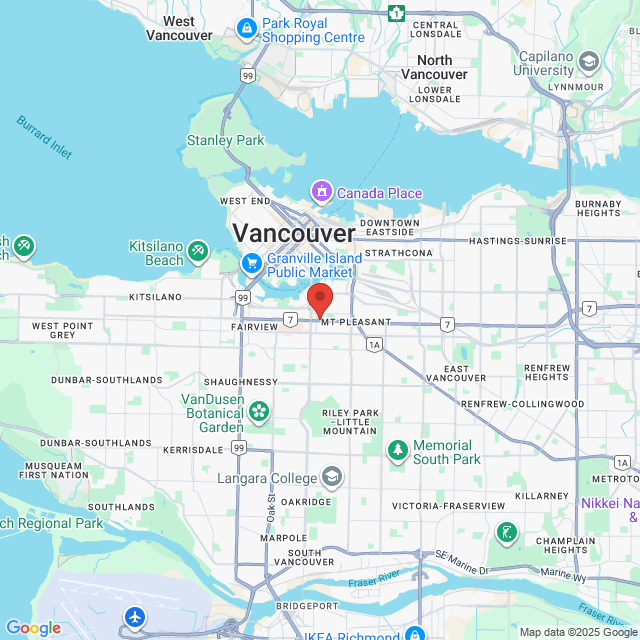 Public Transit: Bus routes 9 and 99 stop nearby, and the Broadway City Hall SkyTrain station is just 1.5 blocks away.